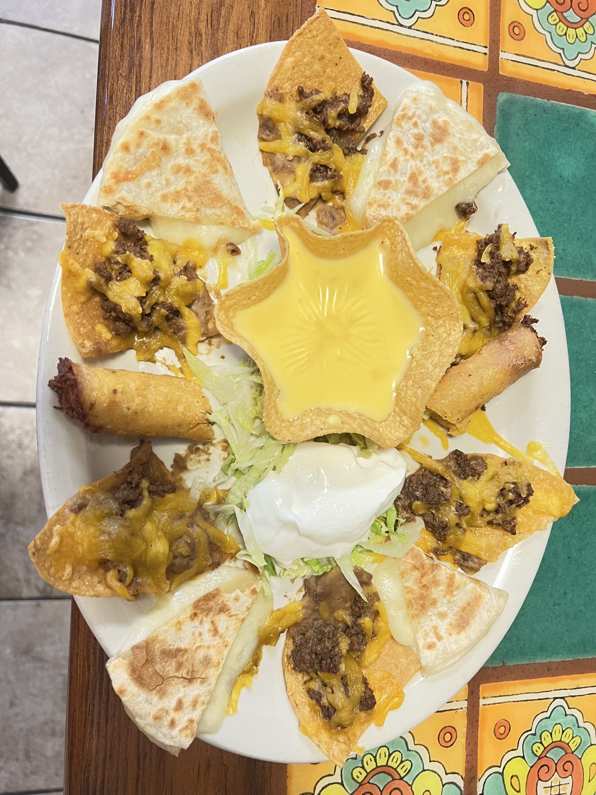 Beef nachos, chicken flautas, cheese quesadilla, cheese dip, and sour cream.